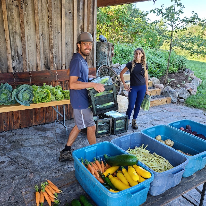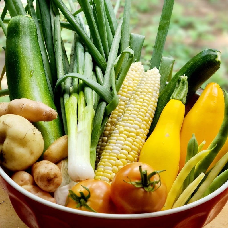 - July – August: Lettuce, New Potatoes, Cabbage, Basil, Zucchini, Corn, Tomatoes, Yellow beans, Carrots, Basil