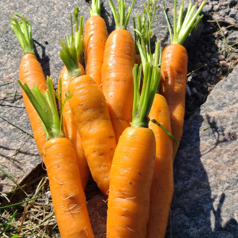 Fresh baby carrots in purple, yellow, and orange hues